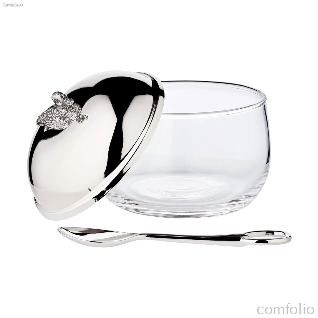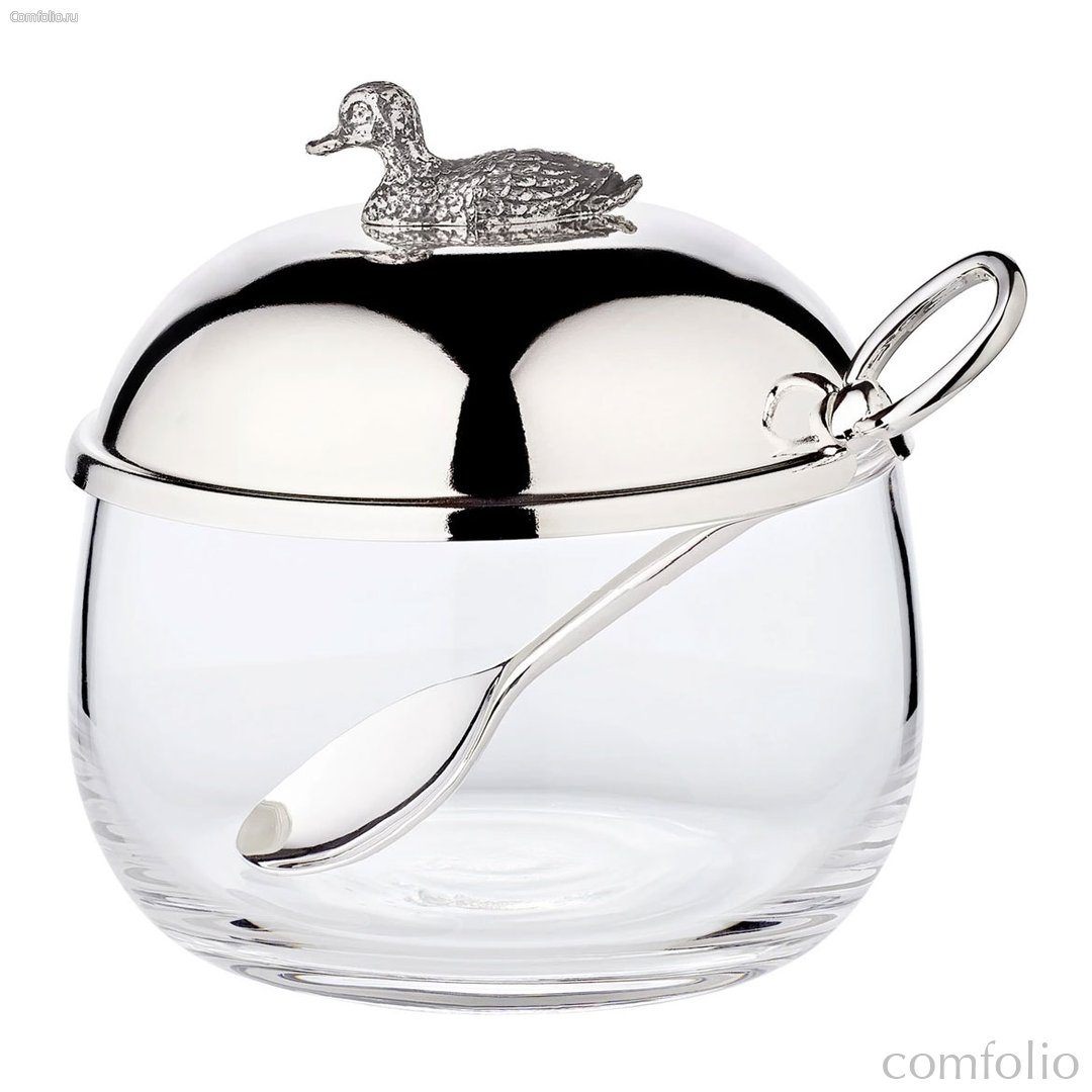 Банка для меда с ложкой Edzard Уточка 320 г, d9хh10 см, посеребрение, стекло - Edzard