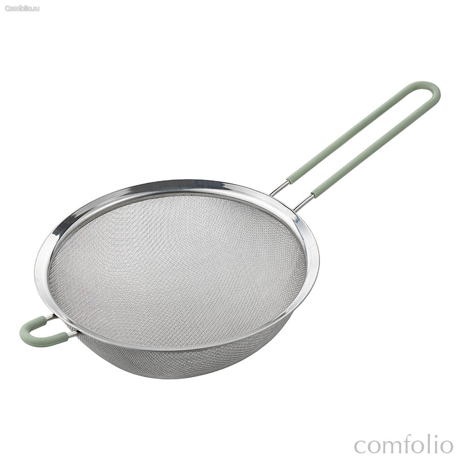 "Сито из нержавеющей стали диаметром 20 см с ручкой и широким ободком подойдет для просеивания пудры, муки, какао, кофе и других мелких сыпучих продуктов. Его можно использовать, чтобы украсить сахарной пудрой выпечку, промыть и протереть ягоды, профильтровать жидкость от мякоти и ненужных остатков. Прибор также подойдет для сливания макарон, риса и других круп. Удобная стальная петля с силиконовой насадкой надежно удерживает сито на кастрюле или другой посуде, не давая соскользнуть, а также может использоваться для навески.