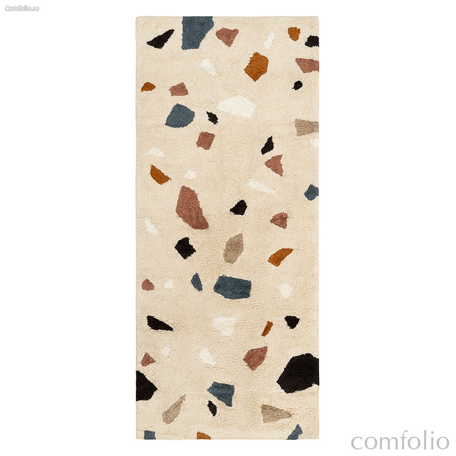 "Терраццо — это особый материал родом из Италии, отполированная основа со вкраплениями гранита, мрамора или цветного стекла, создающими характерный мозаичный рисунок. Полы терраццо можно увидеть в парадных залах венецианских дворцов, а мы перенесли классический итальянский паттерн на мягкую поверхность хлопкового ковра. Прекрасное решение для тех, кто любит классику в необычном проявлении.