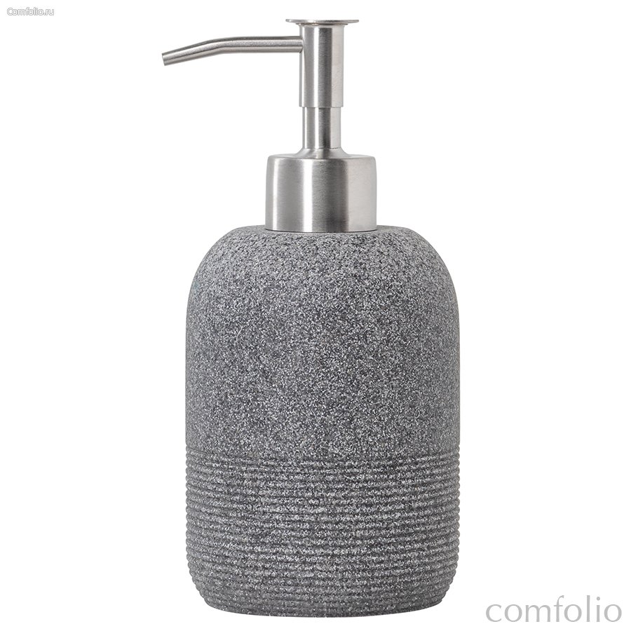 "Диспенсер для жидкого мыла Loup имеет корпус из полирезина, стилизованного под натуральный камень графитового оттенка.