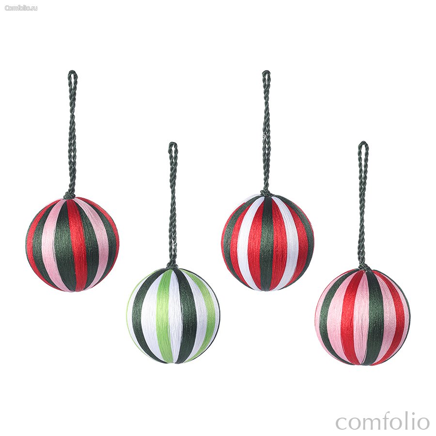"Словно квартет забавных клоунов в полосатых одежках, эти шарики подарят вам трепетное ощущение приближающегося праздника и предвкушения веселых сюрпризов. Разноцветные стильные игрушки обязательно придутся по душе тем, кто предпочитает яркий новогодний декор. , ,