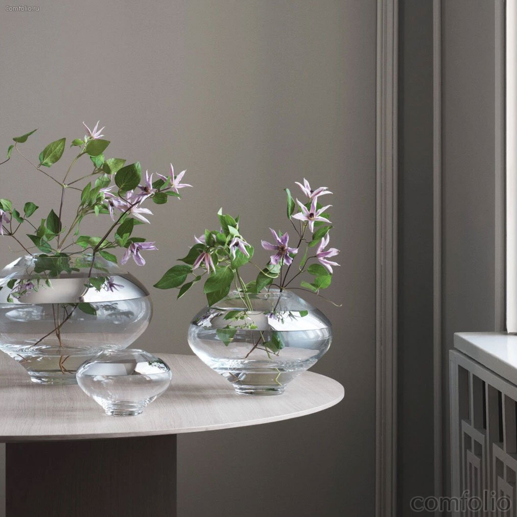 Ваза бренда Georg Jensen, основанного Георгом Йенсеном в Дании, изготовлена из качественных материалов: выдутого вручную стекла и нержавеющей стали, отполированной до блеска. Утолщённое дно делает конструкцию максимально устойчивой. Изделие из коллекции «Дуо» обладает гладкой текстурой и плавными линиями. Благодаря минималистичному дизайну предмет украсит любой стиль интерьера. Зеркальная металлическая вставка в виде кольца красиво отражает цветы, когда они находятся в вазе.
