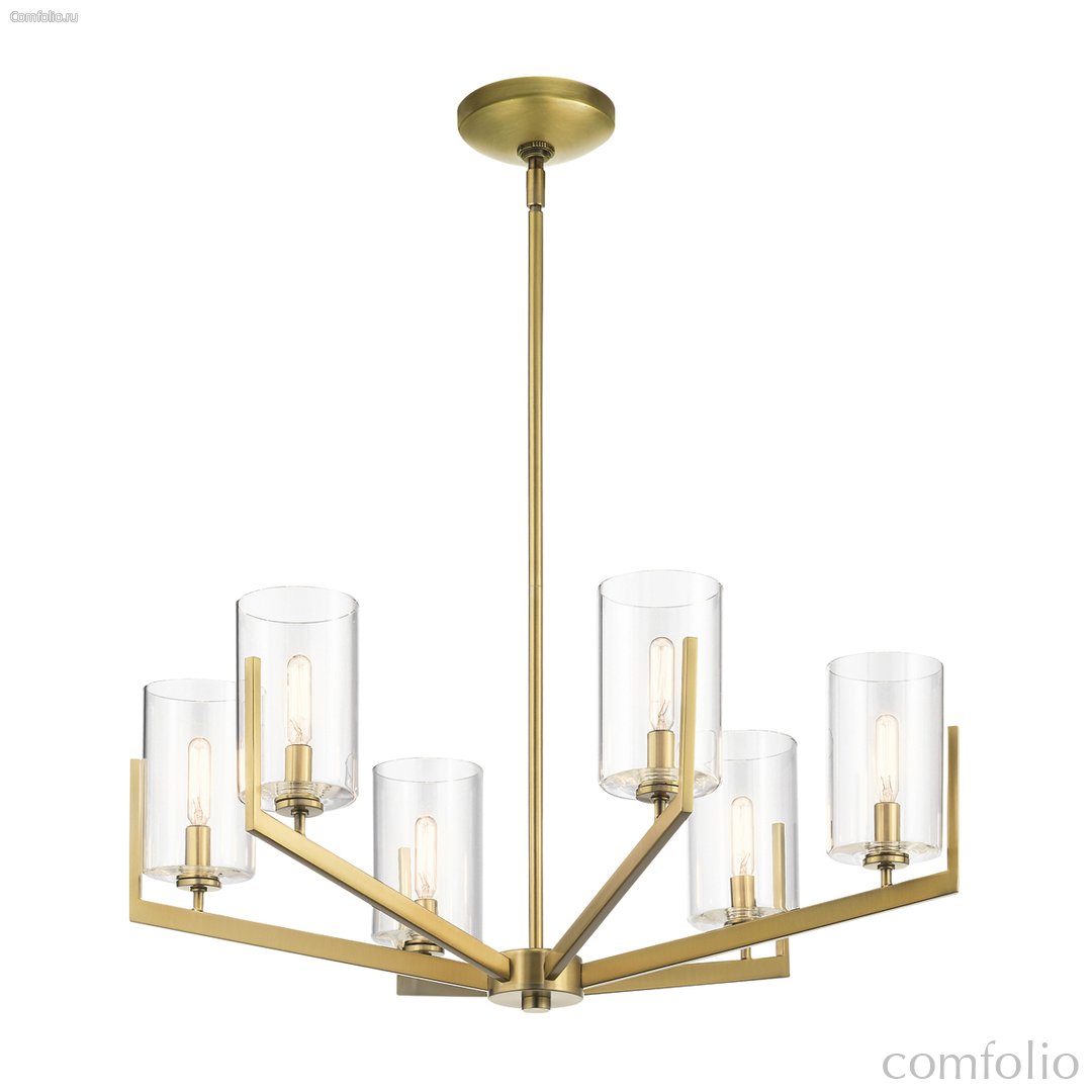 Люстра Elstead Lighting QN-NYE6-BNB. Светильник выполнен в стиле mid-century modern. Изюминкой являются цилиндрические плафоны из прозрачного стекла. Идеально подходит для современной обстановки и для интерьеров в переходном стиле. Рекомендуем сочетать с лампами в индустриальном стиле. Основание выполнено в цвете - Матовая латунь. Можно использовать при освещении гостинной, кухни, спальни, столовой. Поставляется в комплекте со стержнями 1х152 мм и 3х305 мм