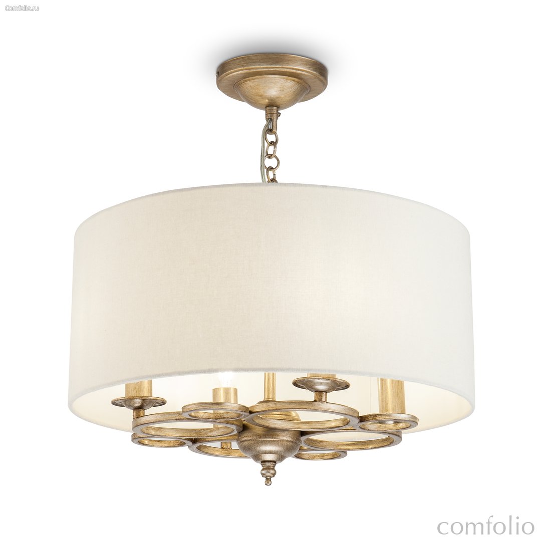 Арматура оттенка античного золота, материал – металл. Абажур из кремового текстиля, нанесенного на ПВХ. Каркас и декор композиции в виде металлических колец. Высота подвесных моделей регулируется.