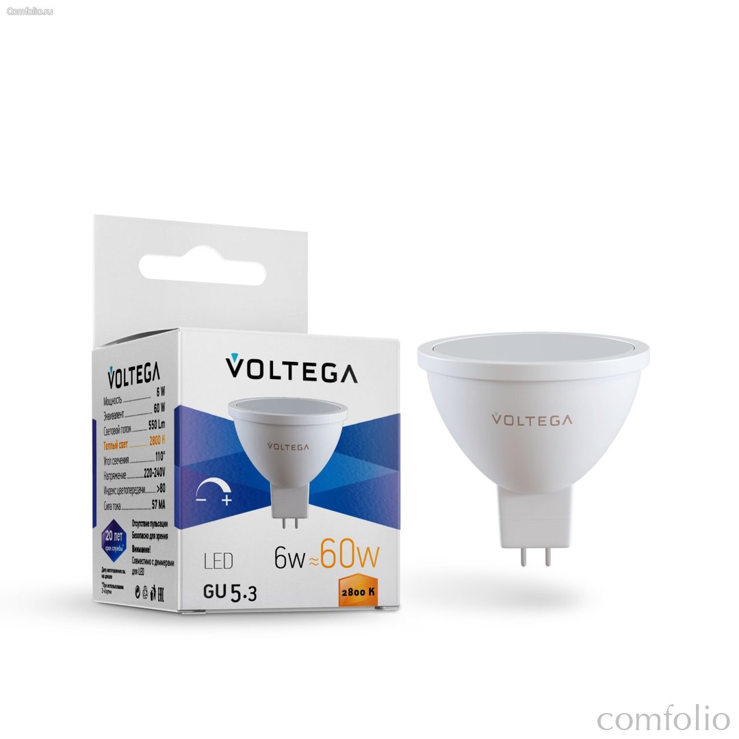 Цена товара Светодиодная лампа MR16 6Вт 2800K GU5.3 110° диммируемая - Voltega указана в российских рублях. При заказе от 5990 рублей - доставка курьером по Москве и почтой по всей России осуществляется бесплатно. Бесплатная доставка при заказе от 5 990 р.