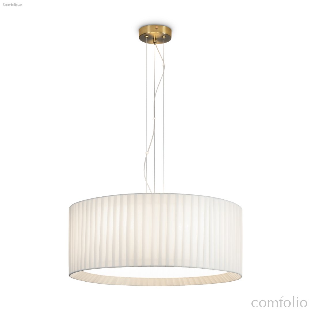 Металлическая арматура в цвете латунь. Подвесные светильники 2-х форм с плессированными абажурами, дополненные рассеивателем. Лампы E27/E14 (не в комплекте) дают мягкий рассеянный свет.