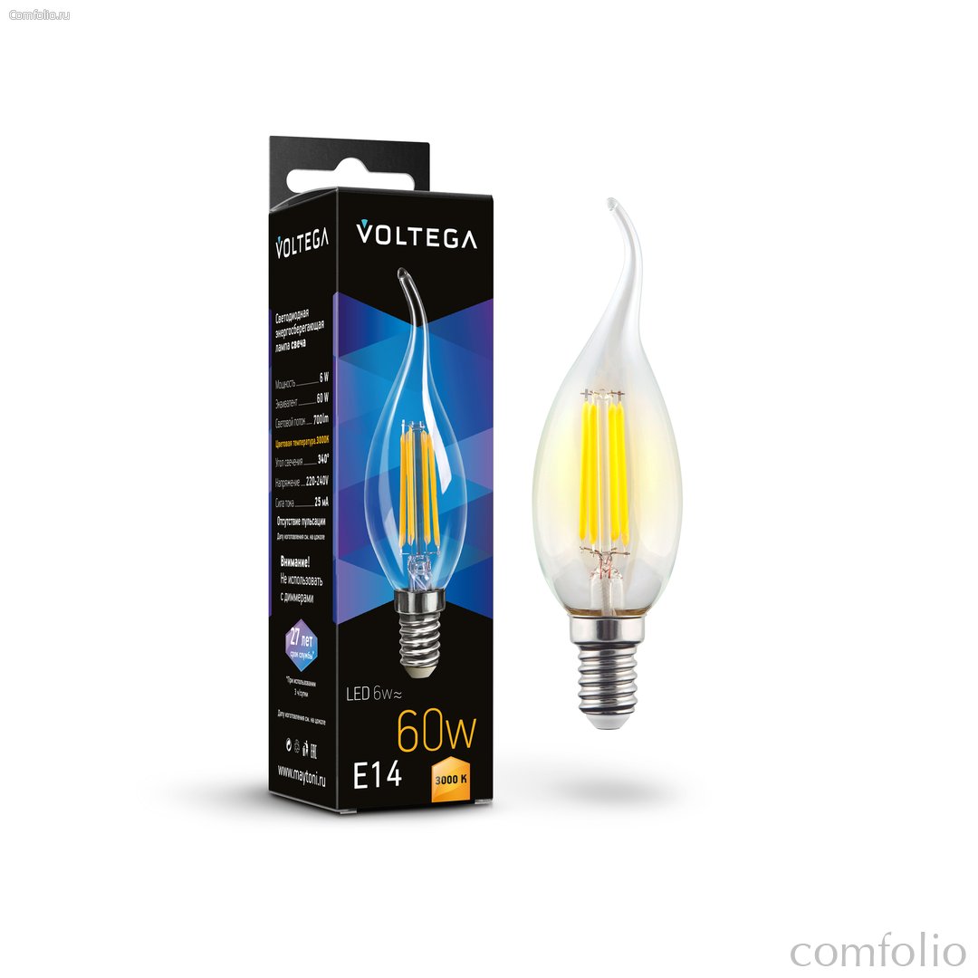 Цена товара Светодиодная лампа филамент свеча на ветру 6Вт 3000K E14 340° - Voltega указана в российских рублях. При заказе от 5990 рублей - доставка курьером по Москве и почтой по всей России осуществляется бесплатно. Бесплатная доставка при заказе от 5 990 р.