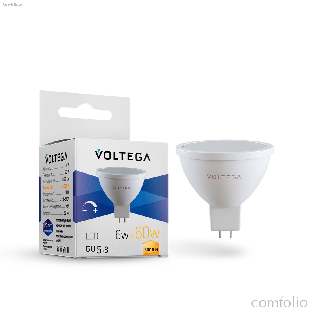 Цена товара Светодиодная лампа MR16 6Вт 3000K GU5.3 110° диммируемая - Voltega указана в российских рублях. При заказе от 5990 рублей - доставка курьером по Москве и почтой по всей России осуществляется бесплатно. Бесплатная доставка при заказе от 5 990 р.
