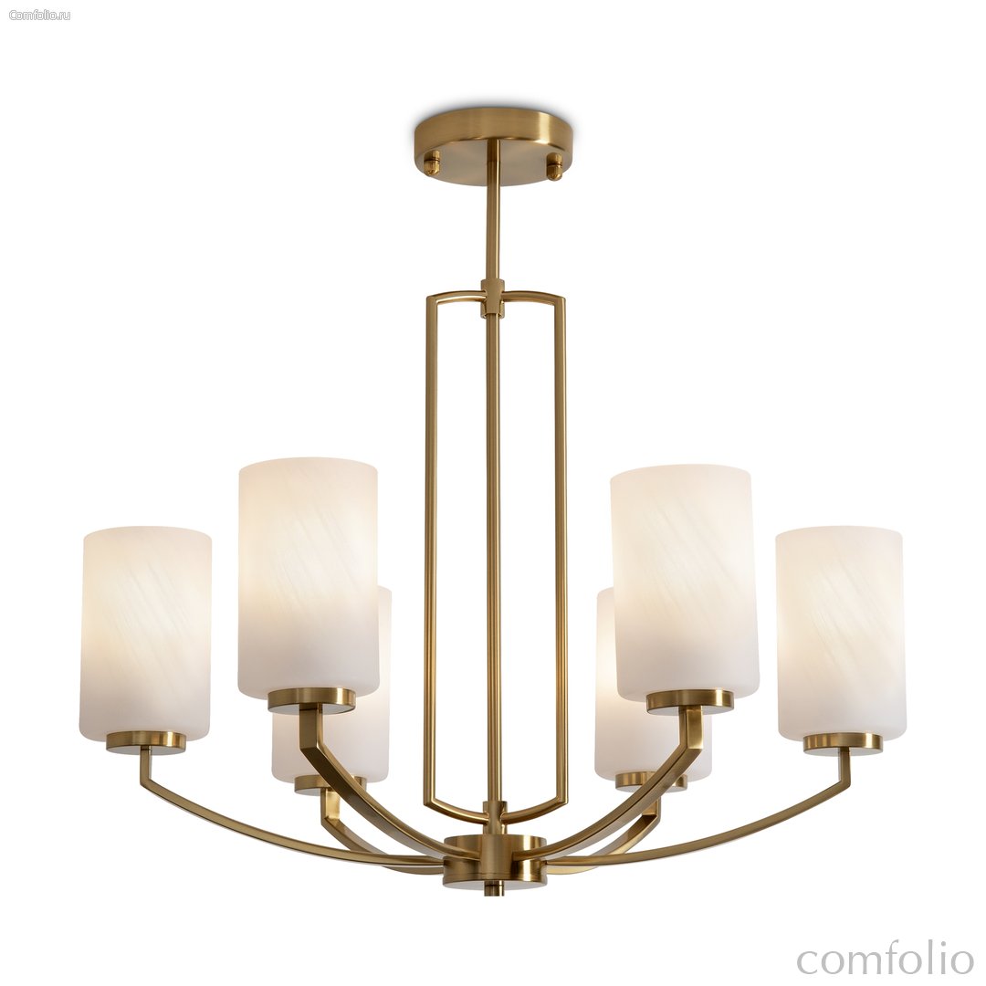 Арматура — металл, латунь. Стеклянные белые абажуры рассеивают свет. Центральное основание создаёт воздушность конструкции. Лампы E14 (5/6 шт., не в комплекте).