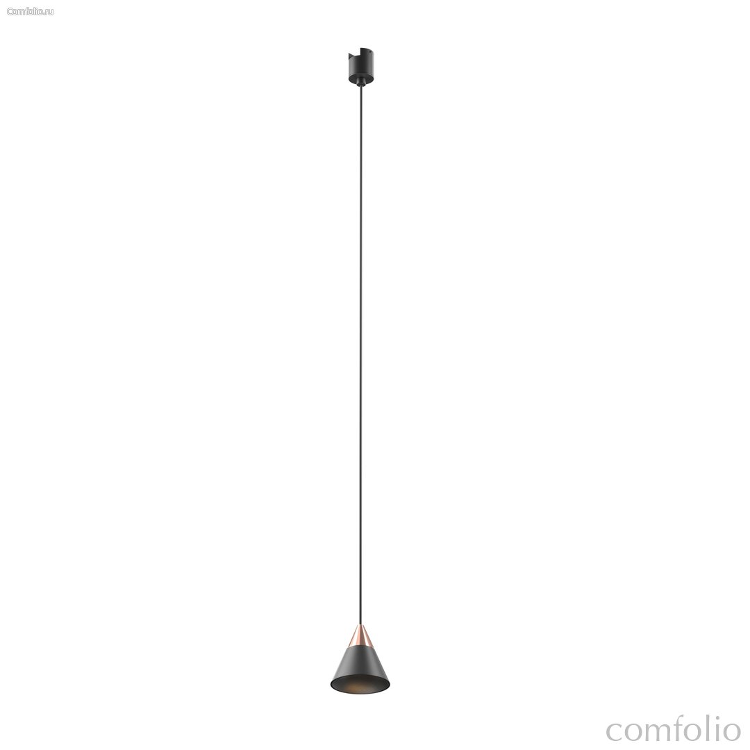 Подвесной светильник необычной конической форме. Материал корпуса - алюминий, цвет - черный. Декоративная металлическая вставка у основания в медном оттенке. Коническая форма обеспечивает смягчение светового потока и узкий угол рассеивания, который составляет 38 градусов. Коэффициент цветопередачи составляет более 90, что позволяет максимально передавать оттенки в помещении.