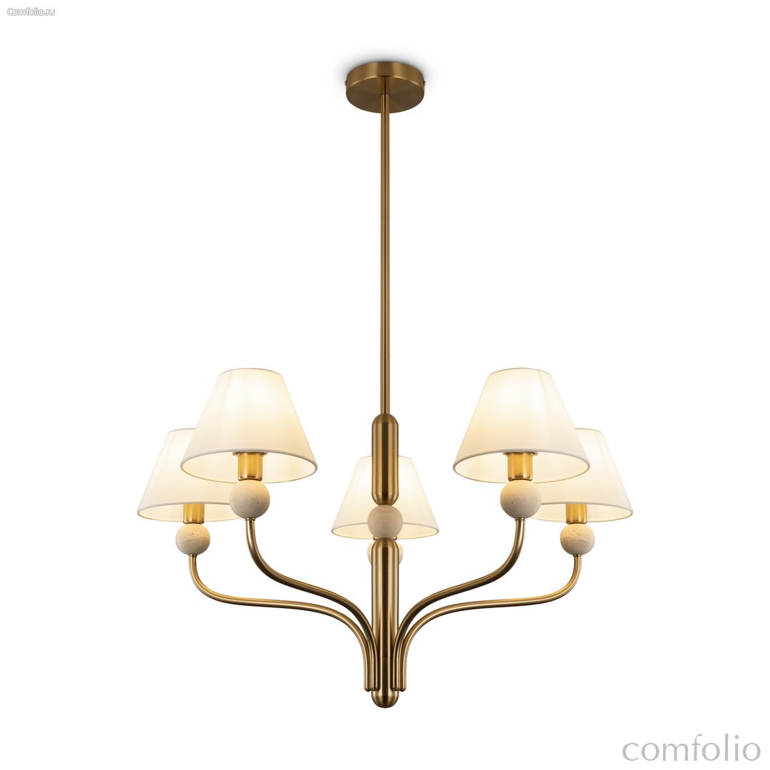Арматура - металл в цвете латунь. Тканевые абажуры, травертиновые элементы. Лампы E14 (в комплекте). Серия состоит из люстры c 5 плафонами и бра. Трендовое сочетание в классическом стиле.