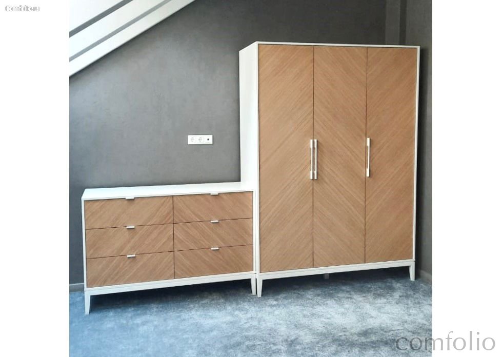 Основание: массива бука Корпус: МДФ под эмалью Фасады: шпон дуба Ящики на бесшумных направляющих с доводчиками