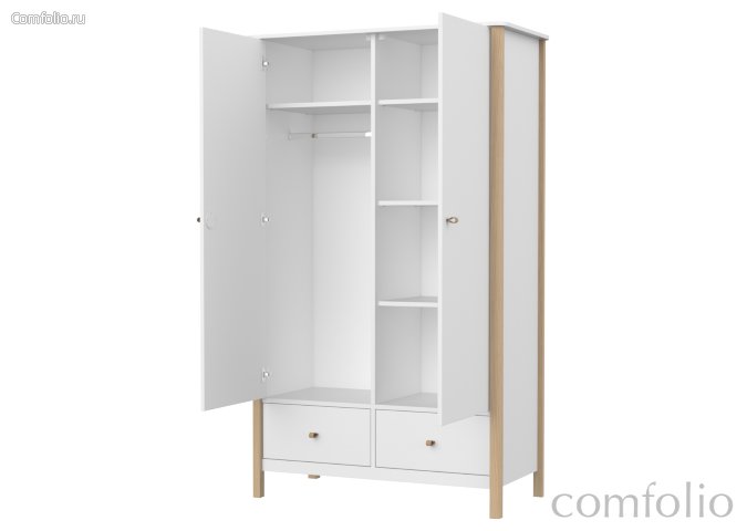 Двухстворчатый шкаф classic имеет два отделения с полками и штангой. Ручки на дверцах и выдвижных ящиках выполнены в виде петель из натуральной кожи.