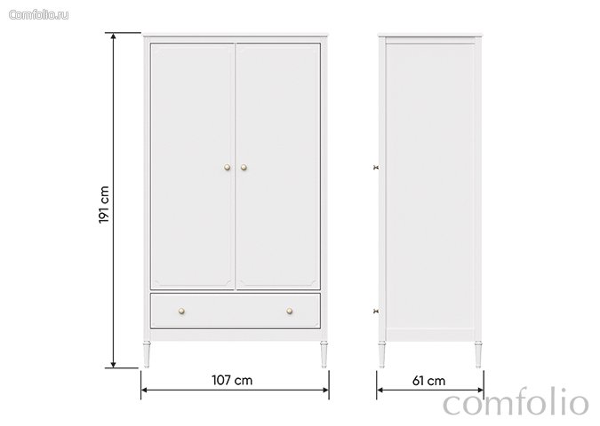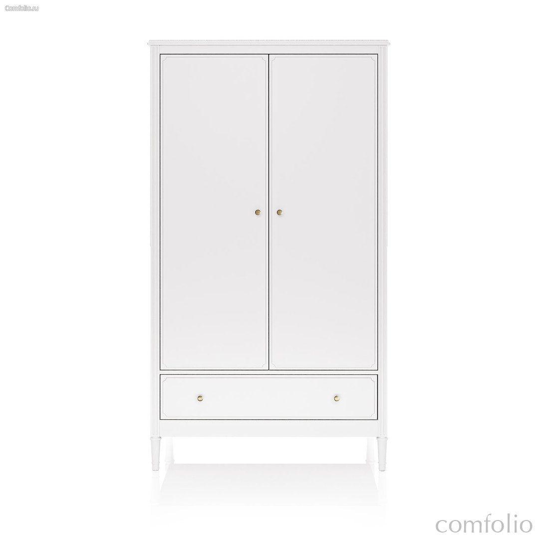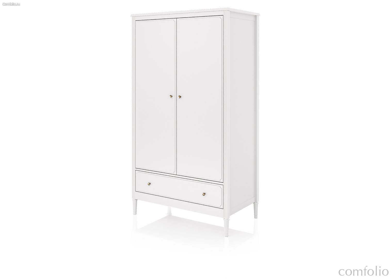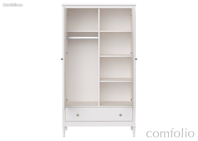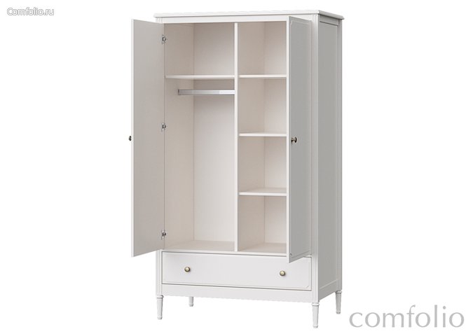 Двухстворчатый шкаф Elit имеет два отделения с полками и штангой. Нижний ящик на бесшумных направляющих с доводчиками.