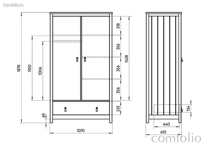 Двухстворчатый шкаф wood имеет два отделения с полками и штангой. Нижний ящик на бесшумных направляющих с доводчиками. Ручки на дверцах и выдвижном ящике выполнены в виде петель из натуральной кожи.