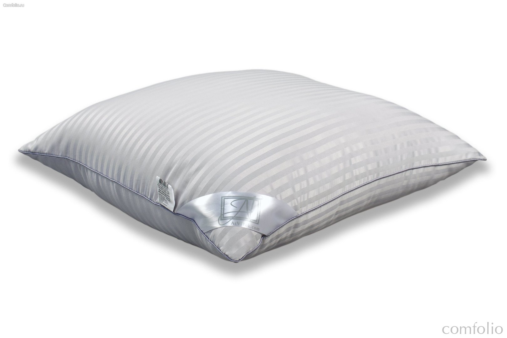 подушка: чехол с молнией ткань 100% п/э - микрофибра Софт-Страйп с Вискозой, наполнитель "Лебяжий пух" (1 кг высокосиликонизированное микроволокно), кант атласный, уголок, флажок, бирка, постер в сумке