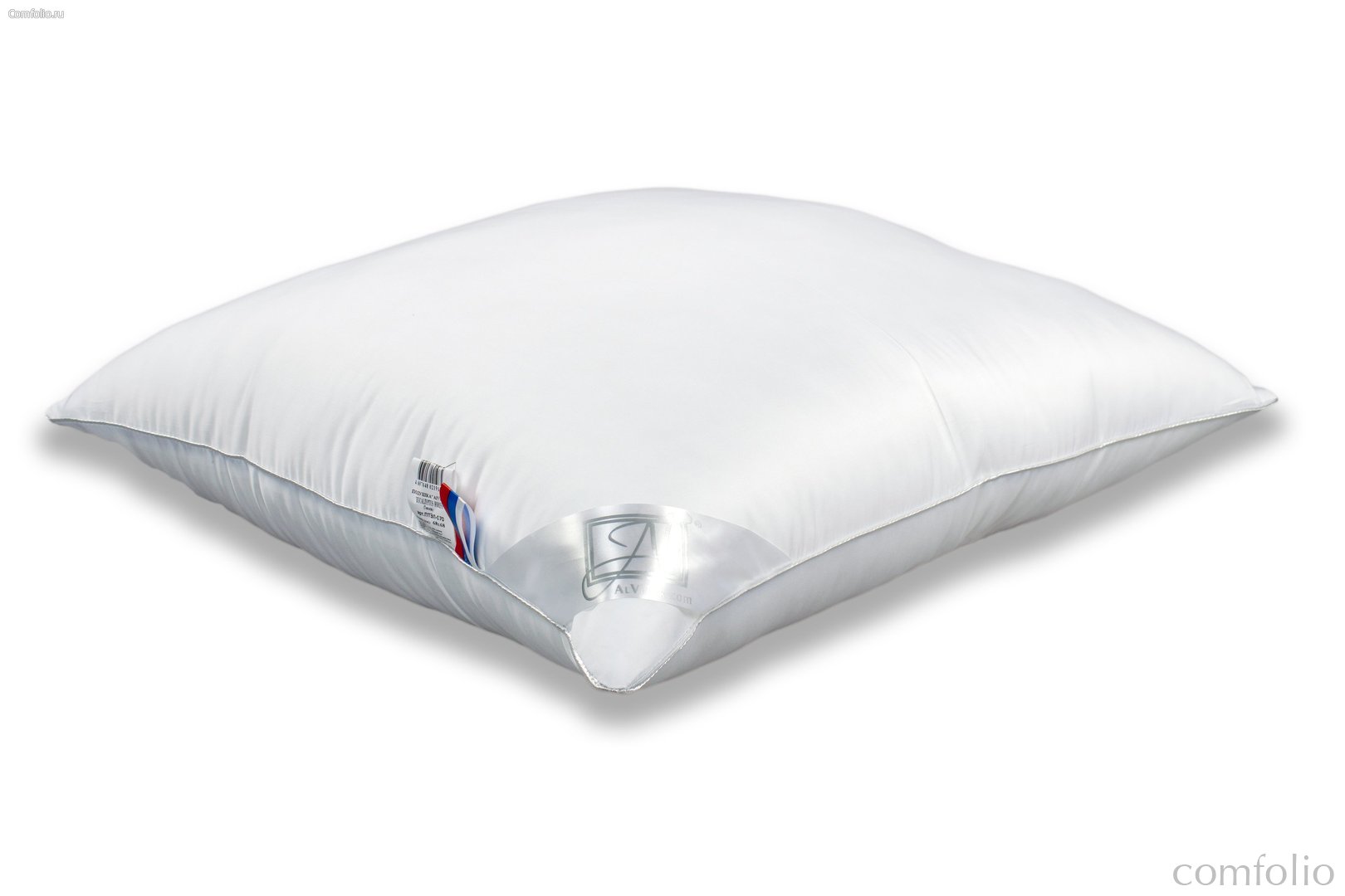 подушка: чехол с молнией (55% Тенсель+45% хлопок) - Тенсель, наполнитель "Лебяжий пух" HUVIS (1 кг высокосиликонизированное микроволокно), кант атласный, уголок, флажок, бирка, постер в сумке
