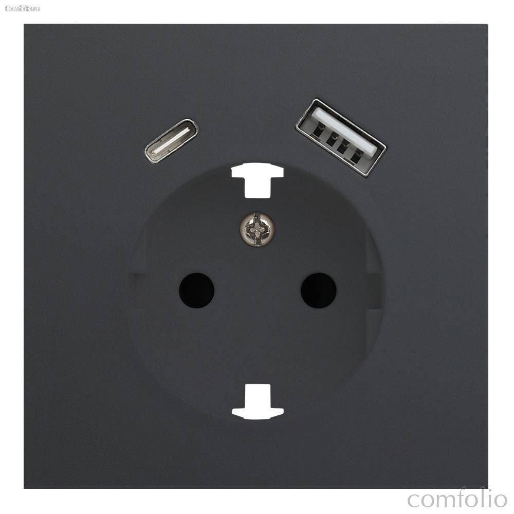 Лицевая панель для розетки 2к+з с USB A+C Rikett 35637 MB, черный сатин