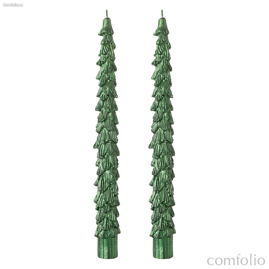 "Набор из двух свечей из коллекции New Year Essential создаст волшебную атмосферу праздника. Высокие зеленые елочки идеально подходят для украшения праздничного стола, камина или подоконника.