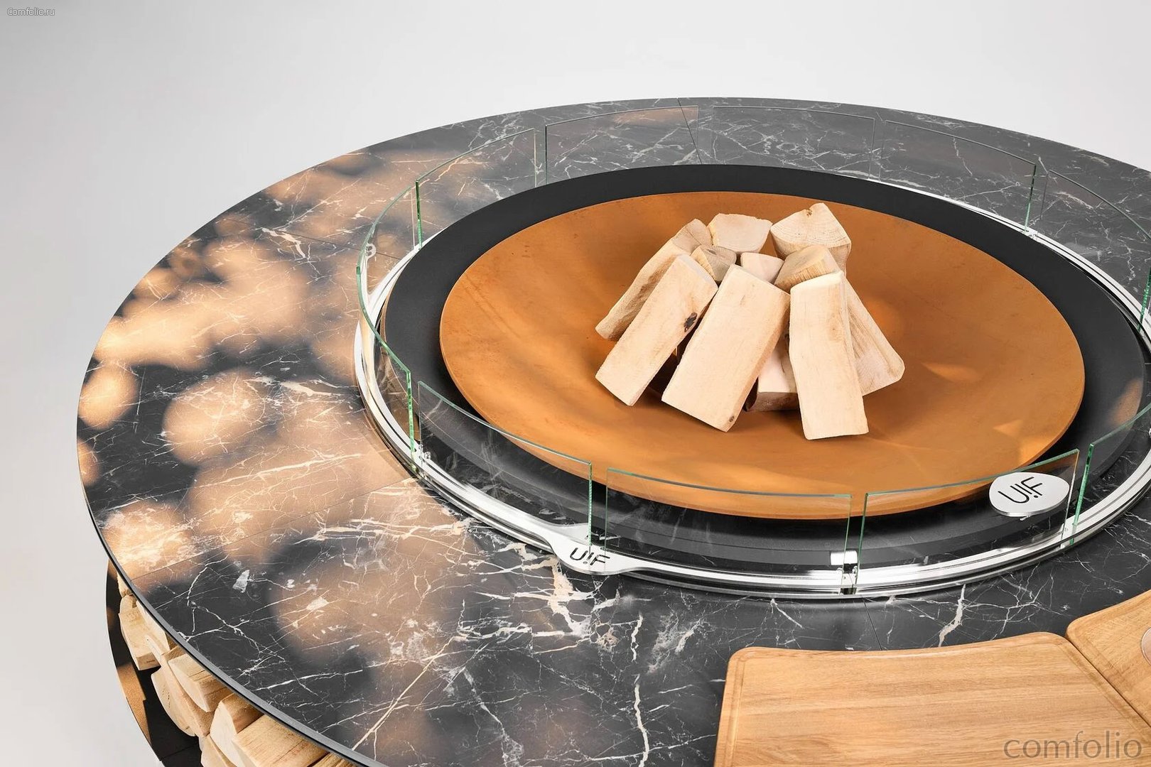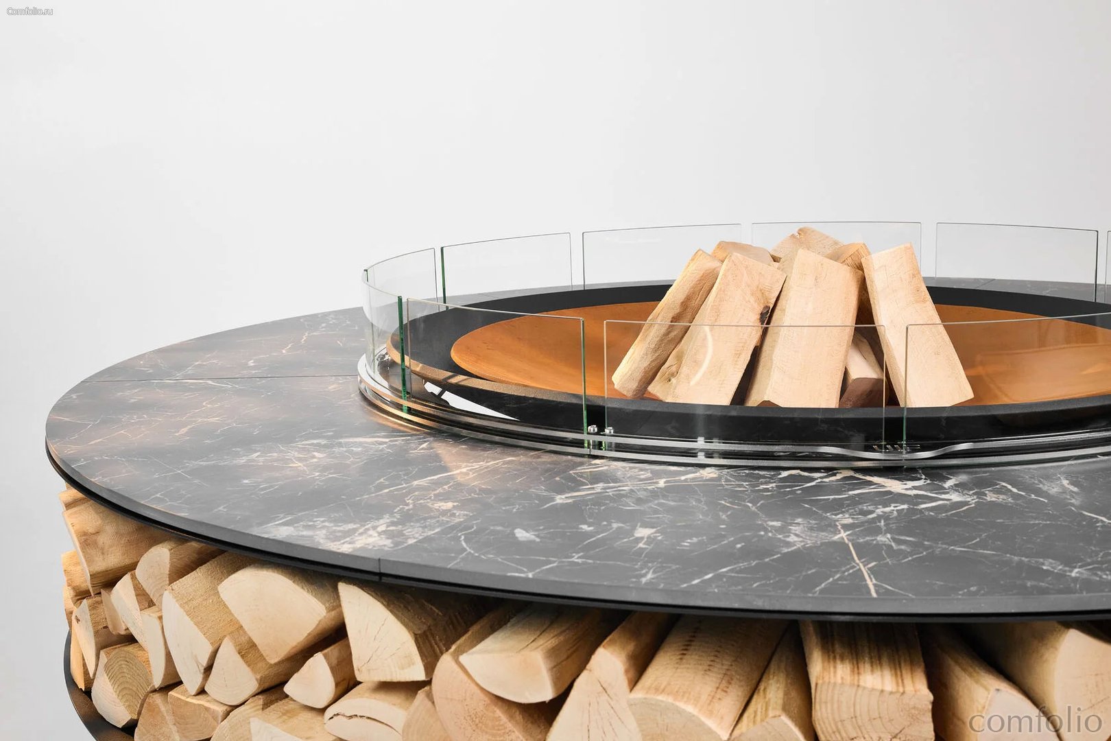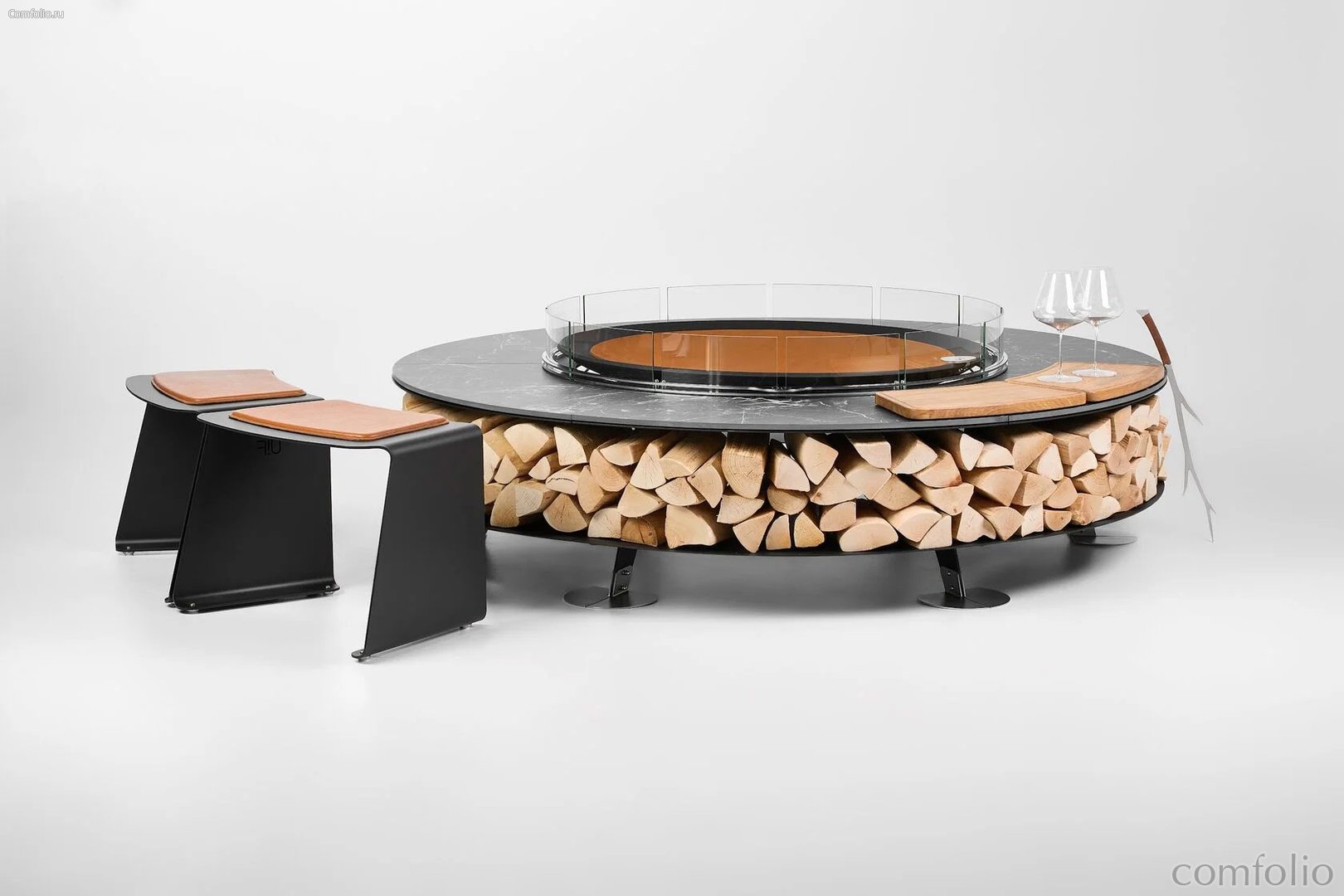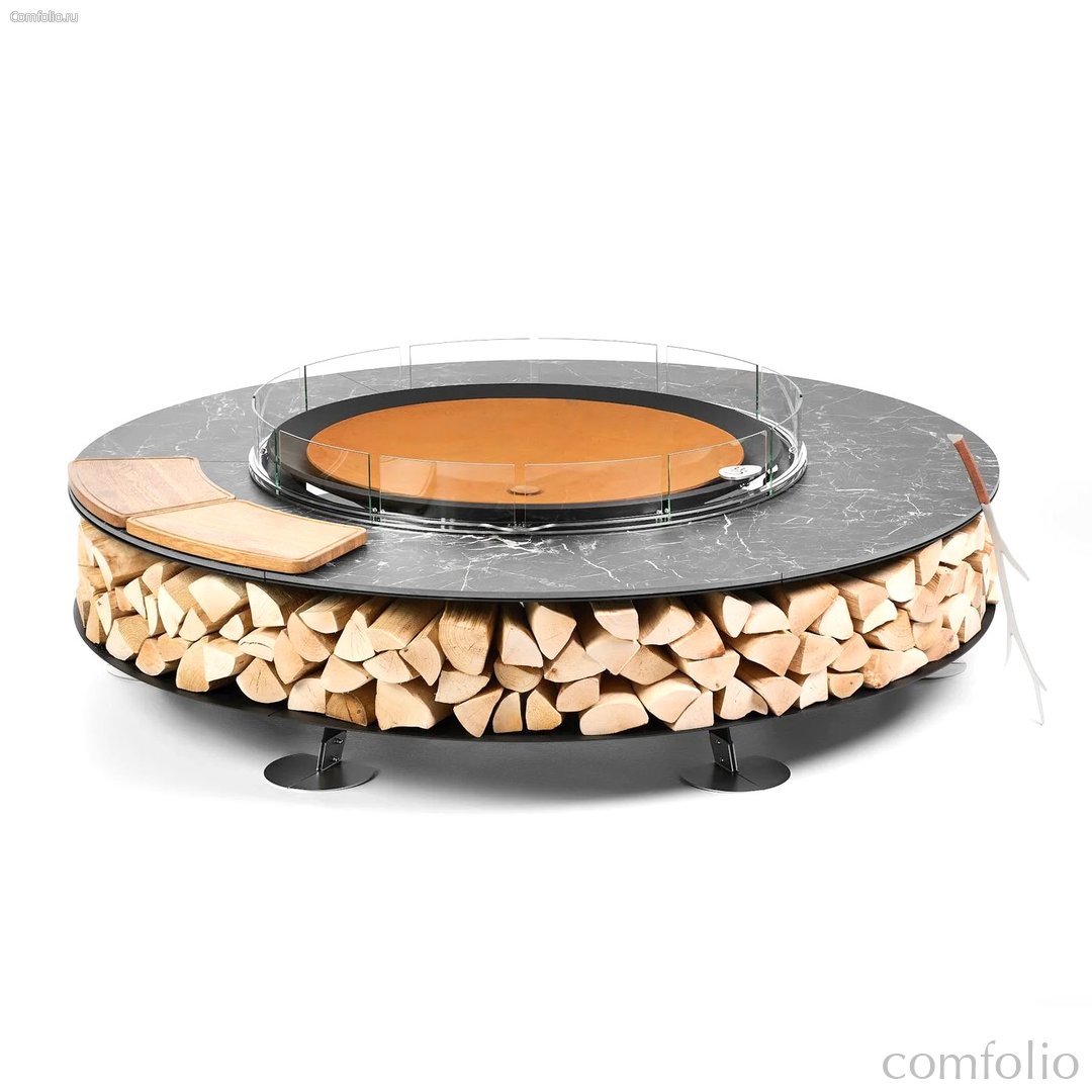 Двойная метровая чаша для огня Double из массивной стали толщиной 10 мм рассчитана на десятилетия использования. Обрамляющий её итальянский уличный керамогранит Marazzi придаёт композиции характер премиальной архитектуры: матовая поверхность и глубокая фактура усиливают гармонию с металлом, подчеркивая скульптурность очага.