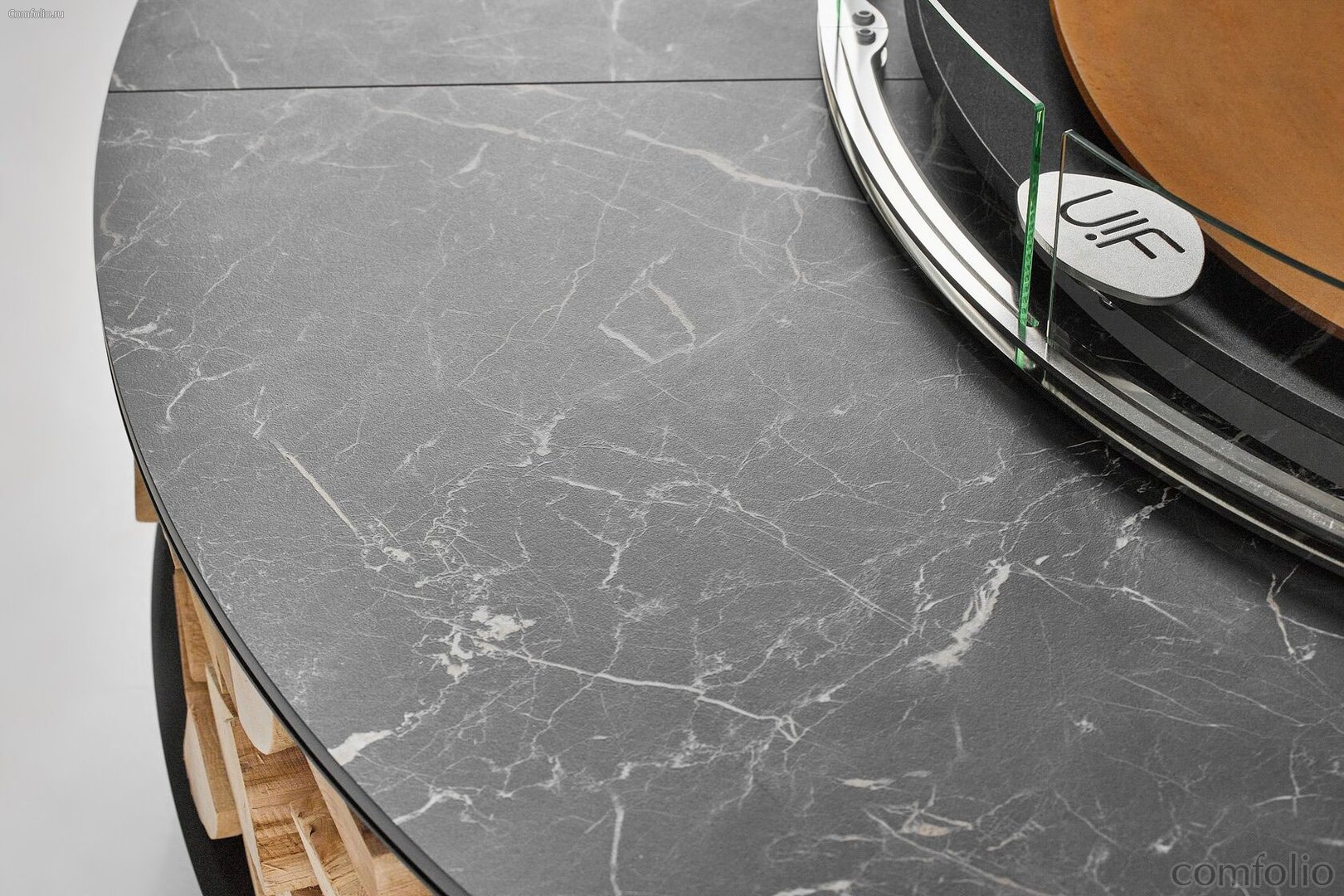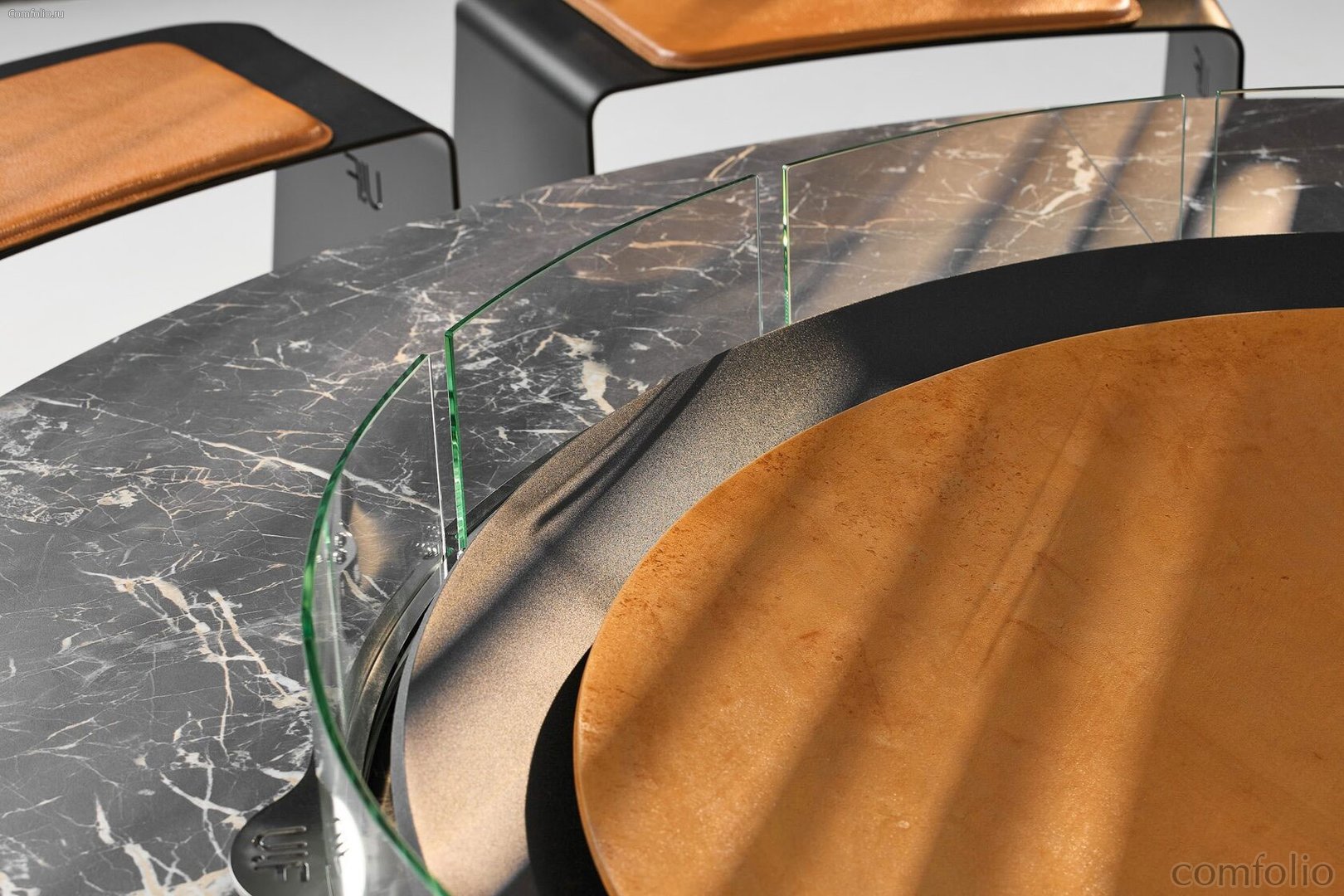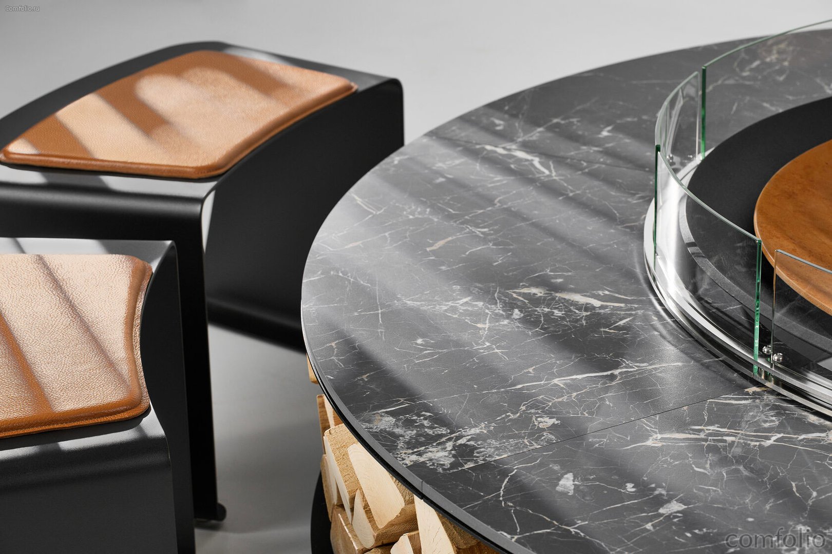 Двойная метровая чаша для огня Double из массивной стали толщиной 10 мм рассчитана на десятилетия использования. Обрамляющий её итальянский уличный керамогранит Marazzi придаёт композиции характер премиальной архитектуры: матовая поверхность и глубокая фактура усиливают гармонию с металлом, подчеркивая скульптурность очага.