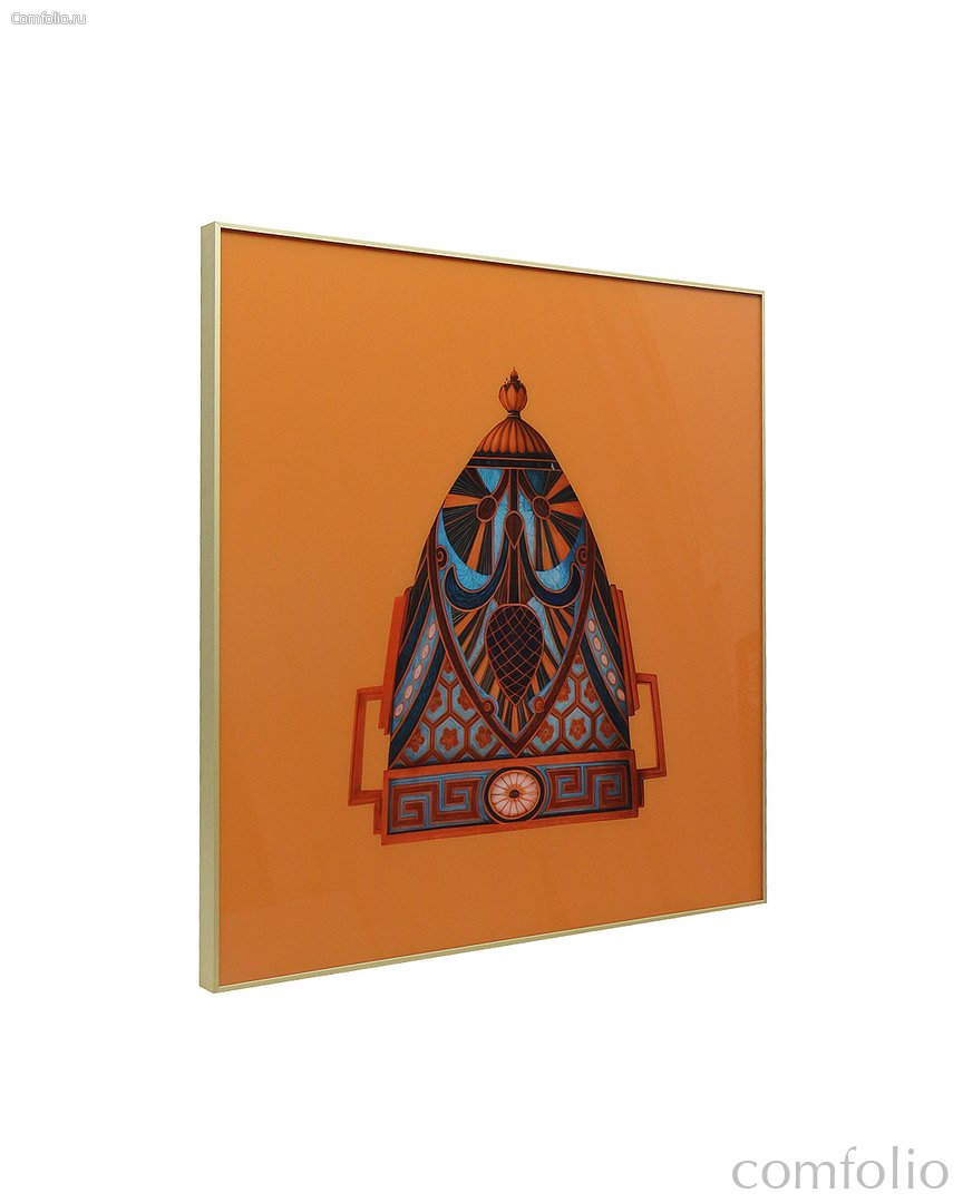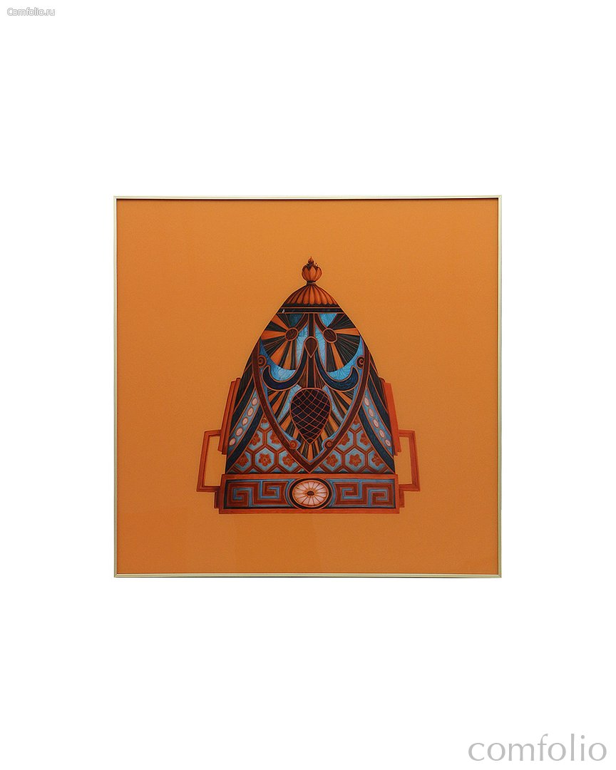 Интерьерная картина "Ванг" выполнена в ярком и выразительном стиле с преобладанием оранжевых, синих и тёмно-красных тонов. Центральным элементом композиции является стилизованный архитектурный мотив, напоминающий восточный храм или шлем, украшенный геометрическими и орнаментальными узорами. Картина сочетает в себе элементы ар-деко и этнического дизайна, создавая впечатление богатства и утончённости. Она станет ярким акцентом в интерьере, особенно в пространстве с минималистичной или эклектичной обстановкой.