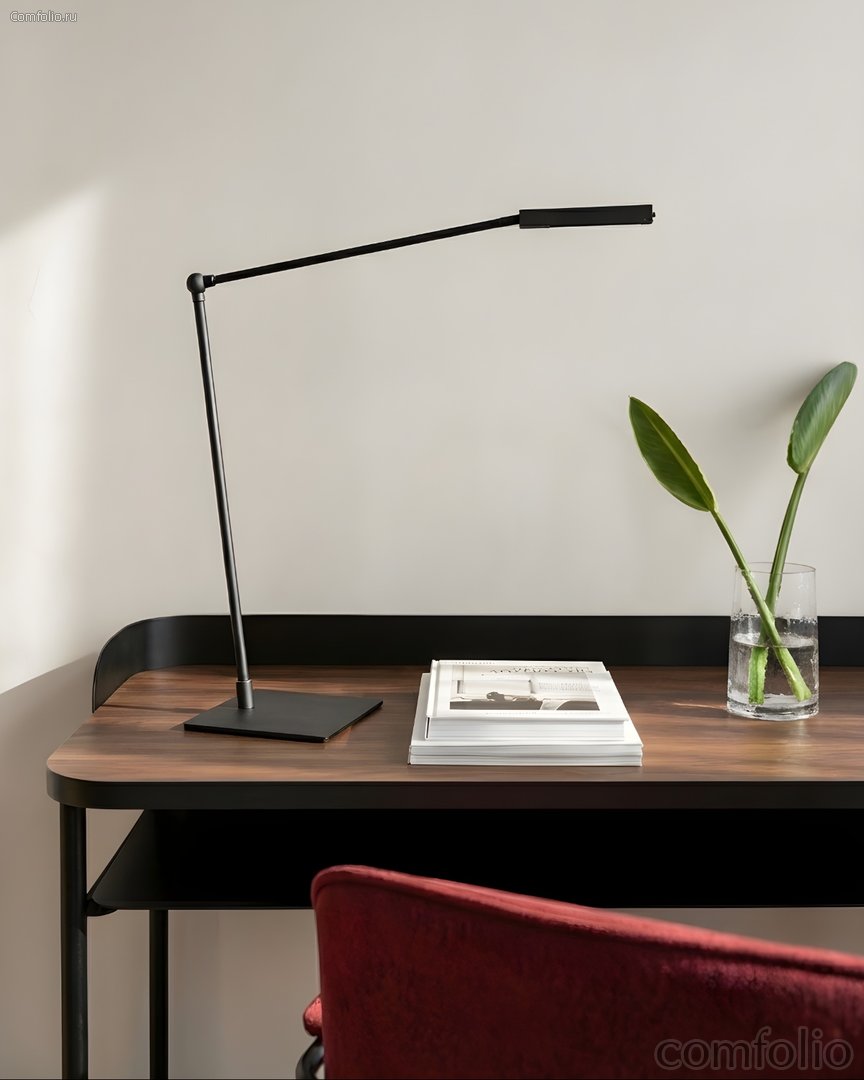 Чёрная настольная лампа «Уве» выполнена в лаконичном современном стиле и идеально подойдёт для рабочего стола, с интегрированным LED-источником света, который обеспечивает равномерное и комфортное освещение. Световой модуль встроен в вытянутый плафон, благодаря чему лампа выглядит минималистично и аккуратно. Конструкция лампы оснащена продуманным механизмом регулирования высоты: подвижные металлические рычаги соединены шарнирным узлом с фиксирующим винтом, который позволяет точно настроить высоту и угол наклона светильника. Благодаря этому свет легко направить именно в нужную точку, не меняя положение основания. Минимальная высота лампы составляет 50 см, что удобно для локального освещения рабочего стола, а общая высота конструкции в разложенном состоянии достигает примерно 92 см. Лампа отлично впишется в интерьеры в стиле минимализм, современный, скандинавский, лофт и хай-тек, а также аккуратно дополнит домашний кабинет, рабочую зону в спальне или гостиной.