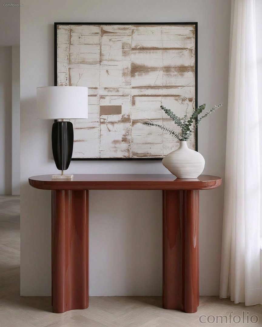 Тёмно-красная консоль "Салли" выполнена в выразительном современном стиле с акцентом на скульптурные формы и насыщенный цвет. Глубокий оттенок дополнен зеркальным высокоглянцевым покрытием, которое отражает свет и добавляет интерьеру динамики и роскоши. Благодаря компактной глубине консоль идеально подходит для оформления входных зон, коридоров или пространства за диваном в гостиной. Она гармонично впишется в интерьеры в стилях неоклассика, ар-деко или современный минимализм, добавляя блеска, элегантности и парадности. Столешница предоставляет место для декоративных элементов, ваз или светильников, превращая консоль в функциональный и визуально эффектный акцент комнаты.