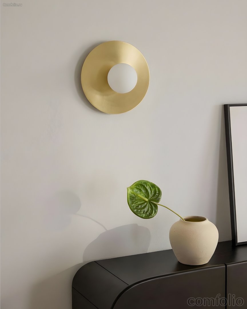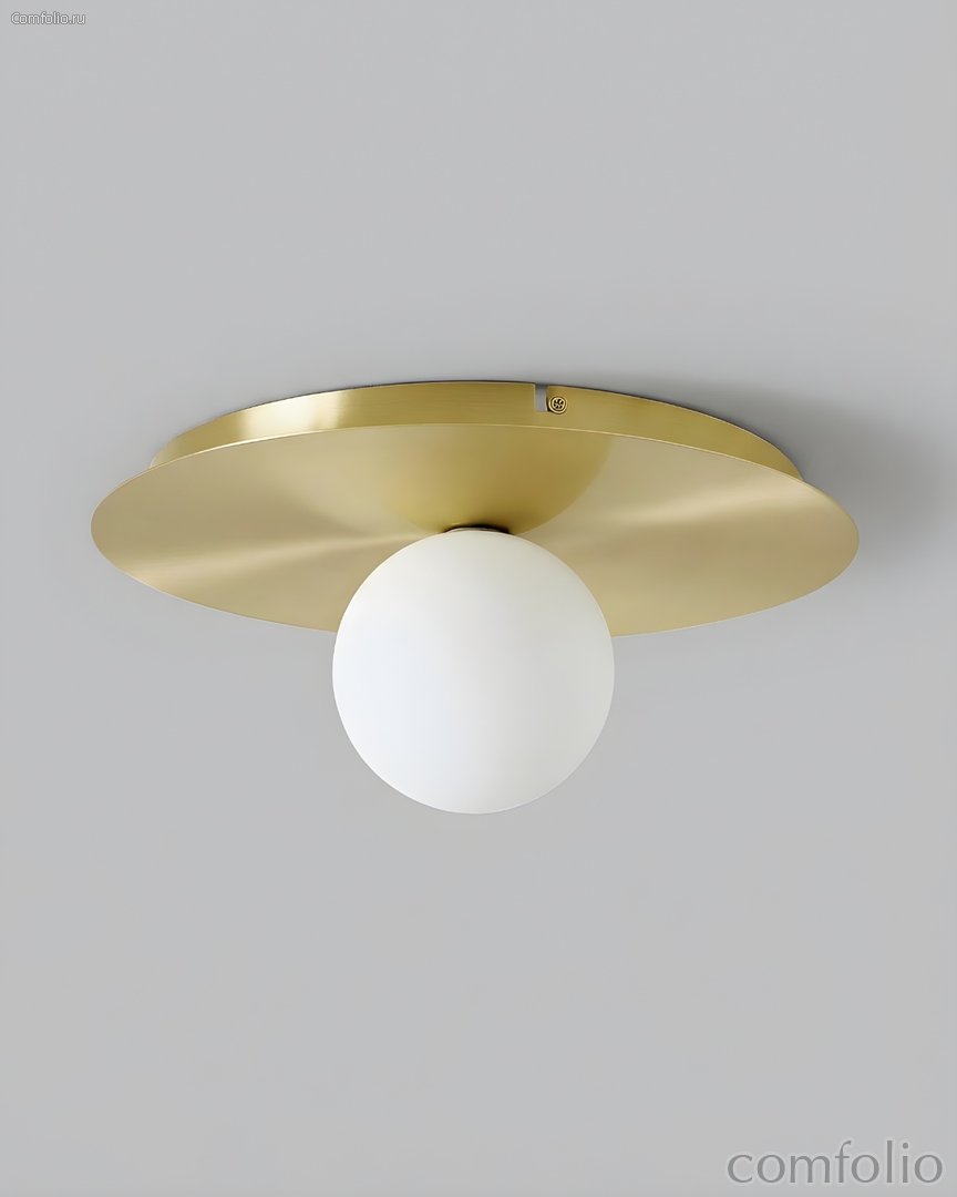 Золотистый настенно-потолочный светильник "Ноа" - это лаконичная и выразительная модель с акцентом на форму и свет. Круглая металлическая основа с отделкой под брашированную латунь создаёт эффект мягкого отражения, а матовый белый стеклянный плафон в форме шара обеспечивает равномерное и комфортное освещение без бликов. Дизайн выглядит графично и одновременно тёпло, что делает светильник универсальным для разных пространств. Светильник может устанавливаться как на стену, так и на потолок, что расширяет возможности его использования. Он отлично подойдёт для гостиной, спальни, коридора, холла или прикроватной зоны, а также для акцентного освещения в интерьере. Компактная конструкция делает модель уместной даже в помещениях с невысокими потолками. «Ноа» гармонично вписывается в интерьеры в стилях современный, американский, minimal, contemporary и modern classic. Светильник может использоваться как самостоятельный декоративный элемент или в композиции из нескольких светильников, добавляя пространству элегантности, чистоты линий и дизайнерской завершённости.