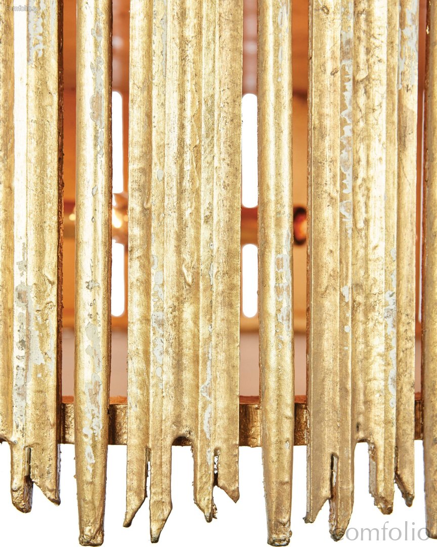 Золотой светильник "Краун" - это подвесной светильник сделан из нерегулярно расположенных деревянных прутьев, в стиле французский кантри. Эффект потёртости и винтажности, который был достигнут в процессе обработки материалов, создаёт ощущение, что этот светильник имеет собственную историю. Он идеально подойдет для тех, кто хочет добавить в интерьер несколько специально состаренных предметов интерьера, которые создают впечатление антиквариата, удачно найденных на блошином рынке, но при этом полностью современным по своему внешнему виду. Этот светильник создан для тех, кто ценит уникальность и хочет добавить в свое пространство нечто особенное, но при этом не потерять атмосферу уюта и теплоты в интерьере. Светильник "Краун" станет прекрасным решением для различных зон вашего дома: он украсит кухню, столовую, гостиную, прихожую.