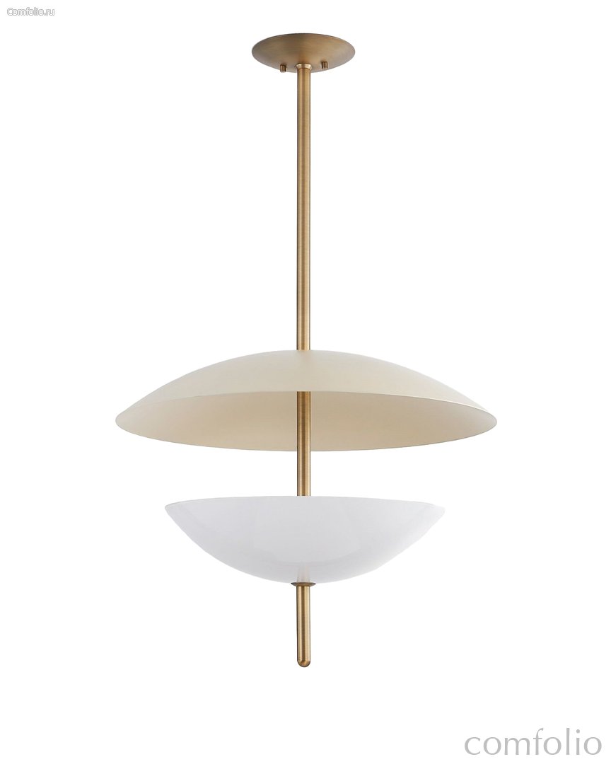 Золотистый подвесной светильник "Чинцио" — элегантный акцент для интерьеров в стиле modern classic, soft contemporary и mid-century. Его выразительная двухслойная форма создаёт мягкое, рассеянное освещение и подчёркивает архитектуру пространства, верхний широкий металлический диск формирует выразительный силуэт, а нижняя полусфера из стекла мягко рассеивает свет и делает освещение комфортным. Светильник выполнен в отделке из брашированной латуни, которая придаёт модели тёплый оттенок. Плафон в цвете белый и слоновая кость гармонично сочетает стекло и металл, обеспечивая комфортный свет без резких бликов. Центральная ось из металла подчёркивает симметрию и делает дизайн визуально сбалансированным. Благодаря диаметру Ø 60 см и общей высоте 50,6 см светильник отлично подходит для размещения над обеденным столом, в гостиной или зоне кухни-столовой. Использование LED-лампы обеспечивает энергоэффективность и современный уровень освещения.