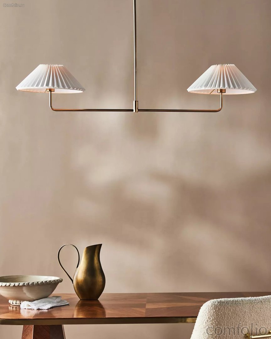 Золотая люстра "Харриет" – это изысканное и стильное освещение, которое добавит элегантность любому интерьеру. Она имеет двухламповую конструкцию, выполненную в минималистичном стиле, что делает ее универсальным вариантом для различных помещений. Комбинация золотистого цвета и белых плиссированных тканевых абажуров создает элегантный контраст, обеспечивая приятное и мягкое освещение. Люстра “Харриет” идеально подходит для гостиной, столовой, спальни или любого другого помещения, где требуется эстетичное и функциональное освещение. Ее дизайн сочетает в себе классические и современные элементы, что позволяет легко вписать ее в различные стили интерьера.