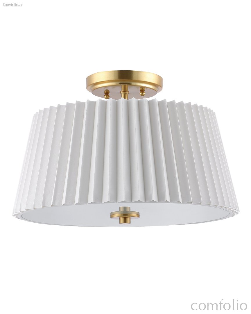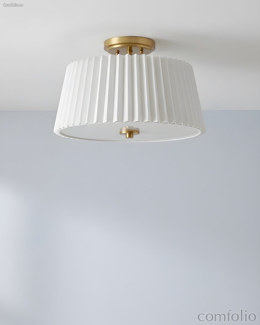 Главной особенностью светильника "Димпл" является его белый плиссированный абажур из ткани. Этот абажур придает лампе игривый и нежный вид, создавая приятную и мягкую атмосферу в помещении. Плиссировка ткани добавляет светильнику объемности и интересности, делая его истинным центром внимания в комнате. Дополнительной особенностью светильника является его металлические акцентные детали, выполненные в цветовой гамме латунь. Он будет отлично сочетается с другими элементами декора и мебели, создавая гармоничное и уютное пространство. Благодаря своим размерам и форме, он легко впишется в любое помещение, будь то гостиная, спальня или кабинет. Потолочный светильник "Димпл" станет прекрасным дополнением к любому интерьеру. сочетающее в себе элегантность и современность!