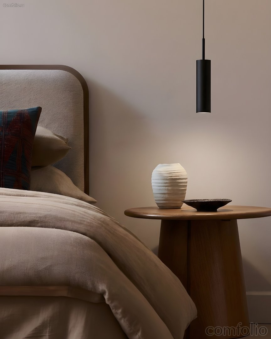 Черный подвесной светильник "Нокс" - это лаконичное и выразительное решение для современных интерьеров. Чёткая цилиндрическая форма и матовое чёрное покрытие подчёркивают минималистичный характер модели, делая её универсальной для различных пространств — от спальни и гостиной до кухни, коридора или зоны чтения. Светильник создаёт направленный акцентный свет, который подходит для подсветки прикроватных тумб, столешниц, обеденных зон и декоративных элементов. Тонкий подвес визуально облегчает конструкцию и не перегружает пространство. «Нокс» может использоваться как одиночный световой акцент или в композиции из нескольких светильников. Модель гармонично сочетается с натуральными материалами, тёплым деревом и нейтральной цветовой палитрой, формируя спокойную и сбалансированную атмосферу в интерьере.
