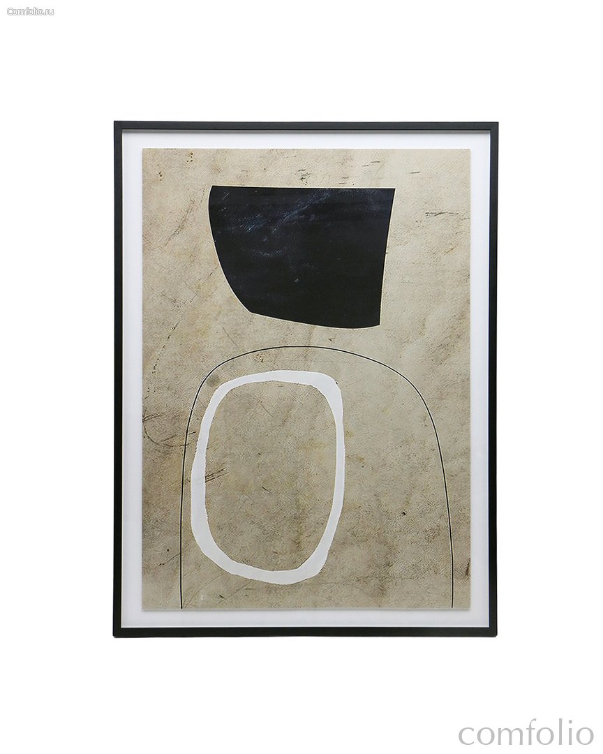 Интерьерный постер "Comfort" - это настенный декор, который выполнен в стиле абстрактного минимализма. На нейтральном текстурированном фоне изображены лаконичные формы: крупная белая линия в виде овала и чёрная геометрическая фигура в верхней части композиции. Тонкие чёрные контуры добавляют глубины и ритма изображению. Работа оформлена в чёрной раме с белым паспарту, что подчёркивает её графичность и делает постер стильным акцентом в современном интерьере. Такой декор идеально подойдёт для пространств в стилях модерн, минимализм или сканди.
