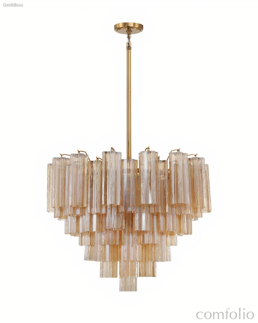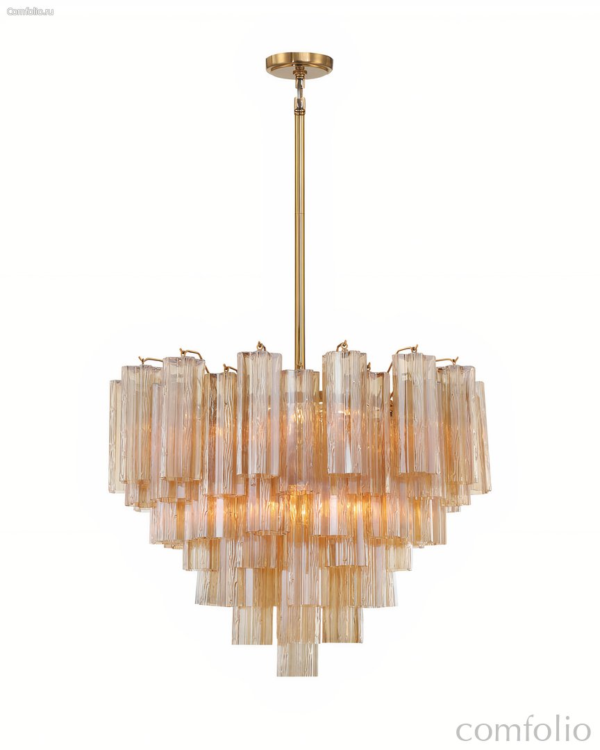 Люстра "Толбот" с янтарным стеклом — это современная интерпретация итальянской культовой люстры "Tronchi" в стиле "Mid-century". Вдохновленная ее элегантными линиями и геометрическими формами, "Толбот" представлена в изысканном металлическом каркасе с покрытием в цветовой гамме латунь, что придает ей стильный и утонченный вид. Уникальный дизайн светильника включает прозрачные ярусы фактурных стеклянных трубок "Трончи". Доступны различные варианты окраски стекла: прозрачное, янтарное, дымчатое и белое, а также потрясающий осенний оттенок "Autumn", в котором эффектно сочетаются стеклянные элементы в цветах янтарь, прозрачный.