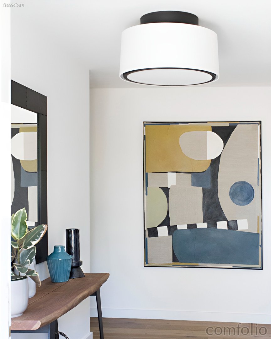 Большой чёрный потолочный светильник "Флемиш" - это круглый белый абажур с чёрным металлическим акцентом вокруг матового рассеивателя. Конструкция светильника крепится на планку скрытого монтажа, что создает минимальное расстояние между светильником и потолком. Дизайн светильника вдохновлен стилем "Мид-сенчури", который делает его универсальным, подходящим для различных стилей декора. Светильник идеально подходит для освещения гостиной, столовой, спальни или других помещений, где требуется функциональное освещение. Он создаст приятный и уютный свет, помогающий расслабиться и создать атмосферу комфорта в вашем доме.