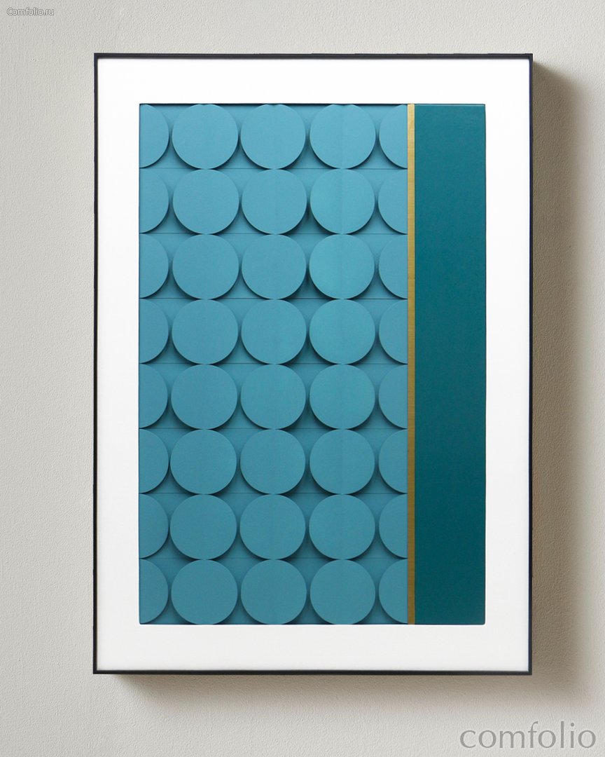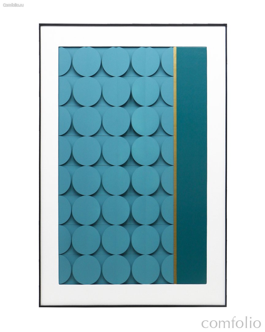 Интерьерное панно "Финч" - это стильный и современный элемент декора, выполненный в геометрическом стиле. Композиция состоит из ряда объемных кругов насыщенного бирюзового цвета, создающих эффект глубины и динамики. Справа размещена вертикальная вставка с золотистой линией, придающей акцент и утонченность общему дизайну. Работа оформлена в тонкую черную рамку с белым паспарту, что подчеркивает минимализм и делает её универсальной для интерьеров в стиле модерн, лофт или сканди.
