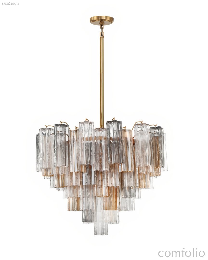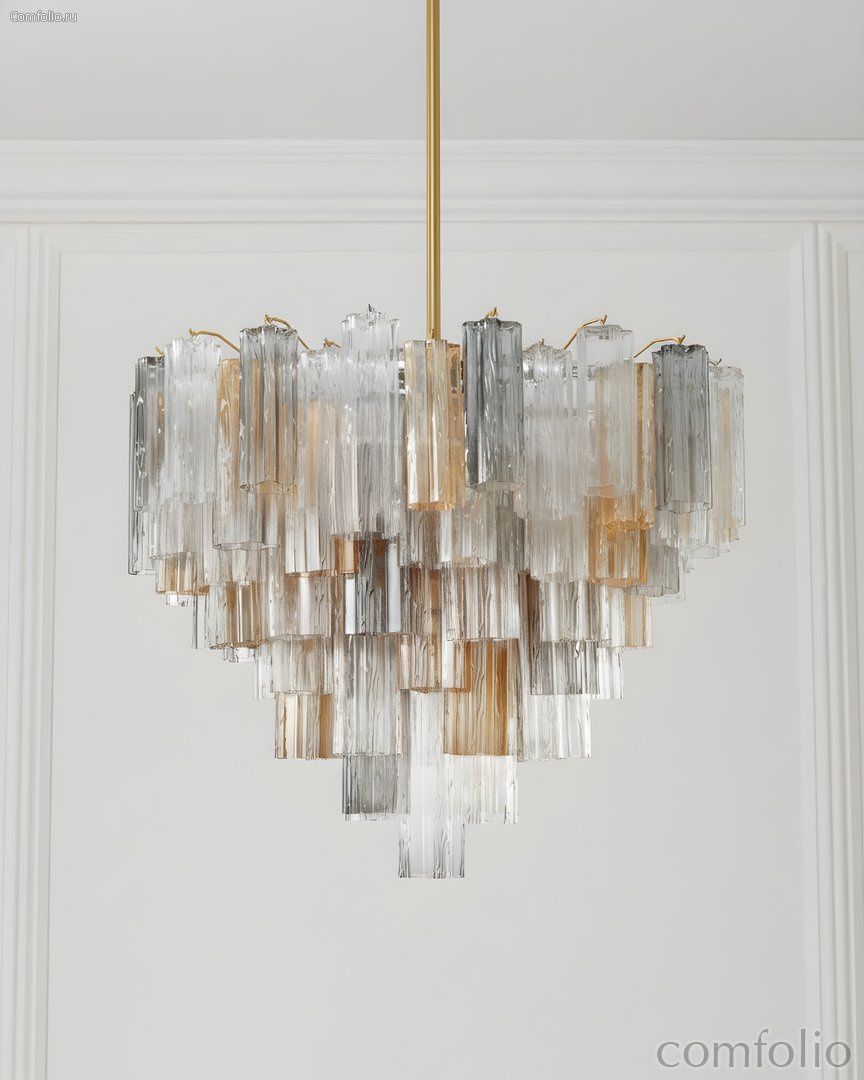 Люстра "Толбот" со стеклом "Autumn" — это современная интерпретация итальянской культовой люстры "Tronchi" в стиле "Mid-century". Вдохновленная ее элегантными линиями и геометрическими формами, "Толбот" представлена в изысканном металлическом каркасе с покрытием в цветовой гамме латунь, что придает ей стильный и утонченный вид. Уникальный дизайн светильника включает прозрачные ярусы фактурных стеклянных трубок "Трончи". Доступны различные варианты окраски стекла: прозрачное, янтарное, дымчатое и белое, а также потрясающий осенний оттенок "Autumn", в котором эффектно сочетаются стеклянные элементы в цветах янтарь, прозрачный.