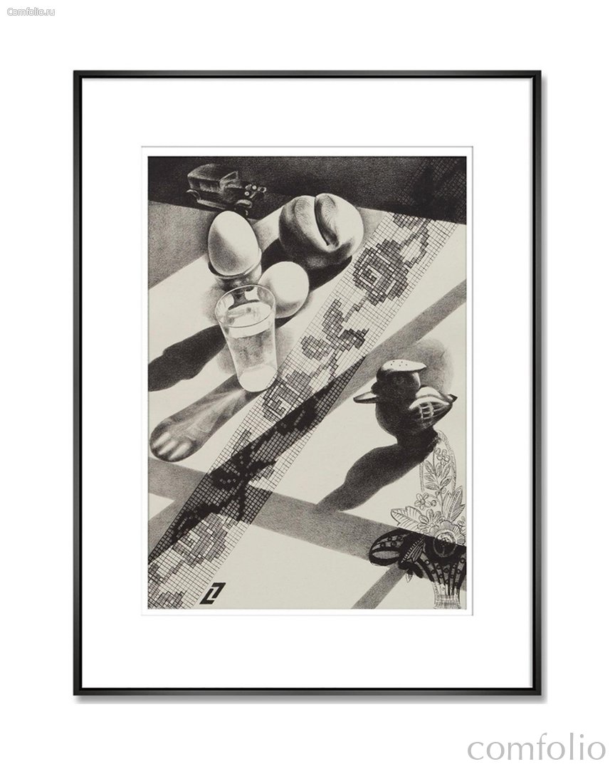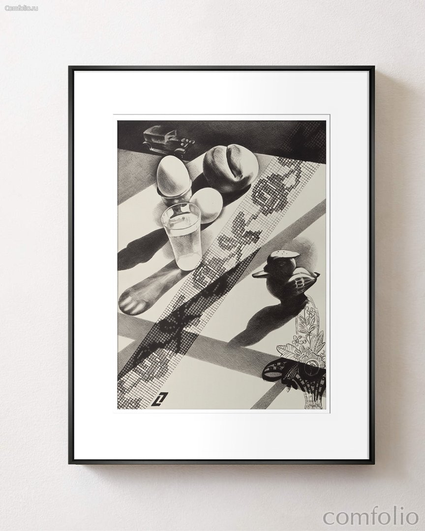 Интерьерный постер "Breakfast" – это репродукция одной из картины [su_tooltip title="Луи Лузовик" text="Американский художник и гравер украинского происхождения. Он известен как художник в стиле ар-деко и прецизионист, и в основном создавал обтекаемые монохромные литографии в урбанистическом стиле за свою карьеру, которая длилась 50 лет." background="#424242" color="#ffffff" font_size="12"]Луи Лозовика[/su_tooltip], которая является синтезом различных стилей раннего модерна: кубизма, прецизионизма и даже сюрреализма. "Breakfast" - это высший пример таланта Лозовика в области тональной литографии. Картина "Breakfast" изображает различные предметы, связанные с завтраком, такие как два яйца, булочка и стакан с прозрачной жидкостью. Они расставлены на сильно наклоненной столешнице, создавая необычную и динамичную композицию. По диагонали композиции проходит лента ткани, которая выглядит как узор для вышитой каймы. Можно предположить, что это рисунок на скатерти, и хотя она выходит за край стола, создает иллюзию глубины и движения. На картине также присутствуют другие интересные детали, такие как игрушечный цыпленок и стилизованный цветочный узор, прорастающий из корзины. Они добавляют элементы игры и природы в композицию, создавая интересный контраст с жестким геометрическим рисунком и растительным орнаментом. Глубокие тени, брошенные объектами, создают дополнительную глубину и объем, контрастируя с плоскими геометрическими и растительными элементами. Этот контраст придает картине особую энергию и динамику. Интерьерный постер "Breakfast" - это не только потрясающий художественный объект, но и отличное дополнение к любому интерьеру. Его яркие цвета, необычная композиция и уникальная комбинация стилей сделают его прекрасным украшением для гостиной, спальни или офиса. Он подойдет как для современного, так и для классического интерьера, придавая ему особый стиль и характер.