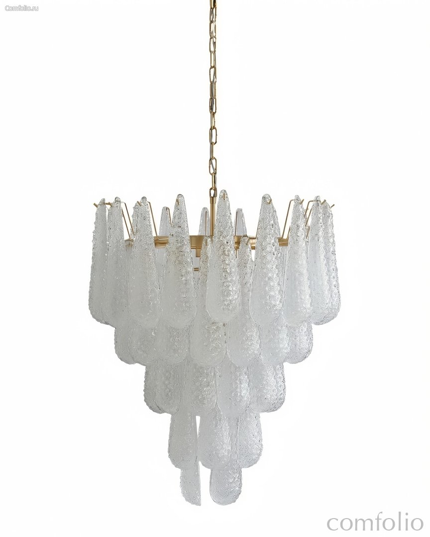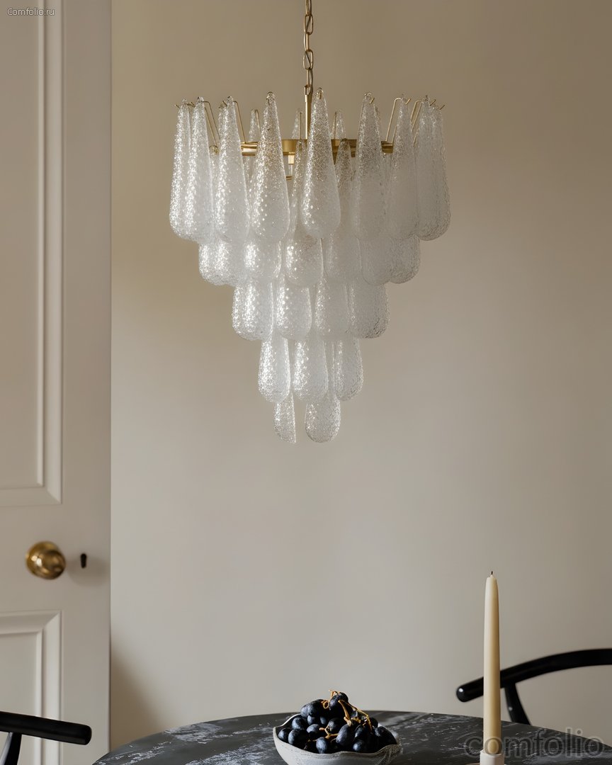 Золотой подвесной светильник "Поуль" - это эффектный многоярусный светильник, сочетающий скульптурную форму и благородные материалы. Конструкция выполнена в цвете золотистом глянце, которая придаёт модели тёплый металлический блеск и подчёркивает её архитектурный характер. Светильник состоит из 5 ярусов и украшен 41 стеклянным элементом вытянутой формы с выразительной фактурой. Композиция выстроена каскадом: такая градация форм формирует динамичный силуэт и создаёт ощущение лёгкости при внушительном объёме конструкции. Модель рассчитана на 5 ламп с цоколем E14, которые обеспечивают равномерное освещение и подчёркивают глубину и фактуру стекла. Светильник подходит как для декоративного, так и для основного освещения пространства. Цепь регулируемая, её максимальная длина - 150 см. Минимальная высота подвеса составляет 98 см, а максимальная - 248 см (от потолка до нижней точки светильника). Это позволяет адаптировать модель под помещения с разной высотой потолков. Подвесной светильник «Поуль» органично вписывается в интерьеры в стилях modern, mid-century, contemporary и soft luxury, становясь центральным акцентом пространства и подчёркивая продуманную эстетику интерьера.