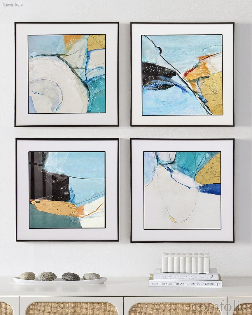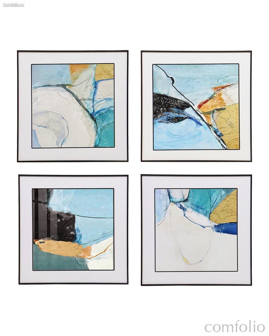 Сет из 4-x картин "Lynx" - это современное абстрактное искусство, выполненное в единой стилистике. Основой каждой работы служит абстракция с элементами коллажа и живописи. В композициях доминируют холодные оттенки — голубой, бирюзовый и белый, дополненные тёплыми акцентами охры, оранжевого и золотистого цветов. Все картины имеют квадратную форму, оформлены в белые паспарту и тонкие чёрные рамки, что придаёт комплекту визуальную целостность и гармонию. Несмотря на индивидуальность каждого изображения, все четыре работы объединены общей цветовой и стилистической темой. В верхней левой картине центральным элементом выступает крупная светлая закрученная форма, напоминающая спираль. Голубые и оранжевые акценты придают композиции ощущение движения и воздушности. Верхняя правая картина отличается более динамичным характером: в нём контрастируют чёрный, синий и золотистый цвета, а композиция вызывает ассоциации с волнами или водным потоком. Нижняя левая картина выполнена в более насыщенной цветовой гамме. Здесь преобладают плотные оттенки, а глубина композиции достигается за счёт тёмных фрагментов и ярко выраженной текстуры. Нижняя правая картина — самый светлый и "воздушный" из всей серии. В нём много белого пространства, а голубые и жёлтые детали придают лёгкость и свежесть. Этот тетраптих станет стильным акцентом в интерьере гостиной, особенно если он выполнен в современном или скандинавском стиле. Также картины прекрасно подойдут для оформления кабинета, офиса или спальни, если вы хотите добавить в пространство нотки спокойствия и визуальной прохлады.