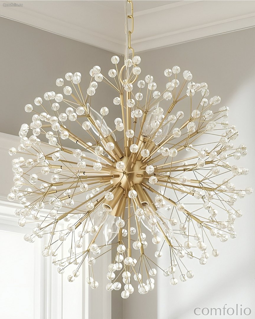 Золотая люстра "Норвич" - это причудливая форма в виде шара из тонких стеблей в цветовой гамме - латунь, которые разветвляются, образуя эффектное основания люстры. Усиливают эффект от этой люстры сверкающие хрустальные шарики, расположенные на кончиках каждой из множества ветвей. Люстра напоминает одуванчик, который волшебным образом превращается в мерцающую звезду. Свет, проникающий через хрустальные шары, разбивается на множество лучей, который будет распространяться по комнате, создавая волшебную атмосферу. Она идеально подойдет для гостиной, столовой или спальни.
