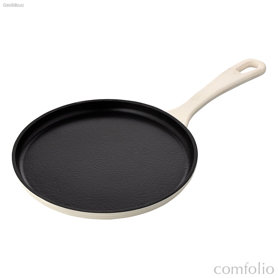 "Сковорода блинная чугунная ?24 см из коллекции «Шеффилд», молочная – та самая посуда, которая будет служить десятилетиями. Долговечный и прочный материал быстро и равномерно распределяет тепло по поверхности, обеспечивая идеальный прогрев блюд.